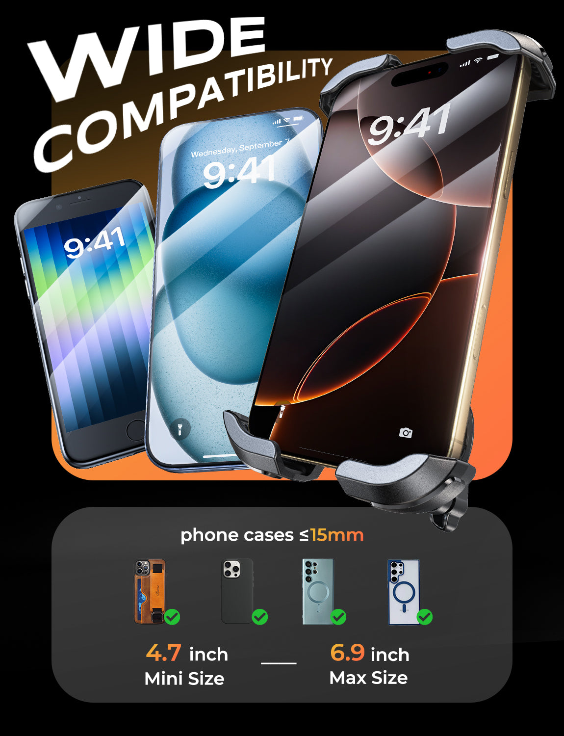 - 【Wide Compatibility】This universal bicycle phone mount is designed for smartphones ranging from 4.7 to 6.9 inches, compatible with iPhone 17 Pro Max/iPhone 17 Air/iPhone 16 Pro Max/16 Plus/15 Pro Max/15 Plus/15/14 Pro Max, Galaxy S25/S24 Ultra/S24+/S24/S23 Ultra/S23. With a thickness allowance of up to 15 mm, it even accommodates phones with protective cases, ensuring a secure and snug fit for all your devices.